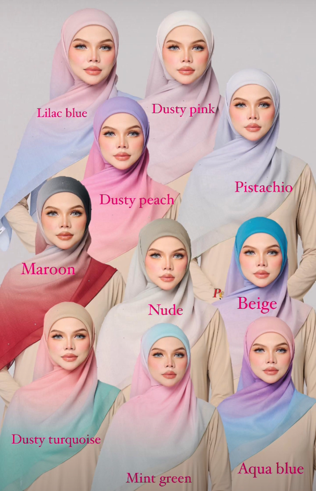 | Color | Aqua blue, Beige, Dusty peach, Dusty turqoise, Lilac blue, Maroon, Mint turqoise, Nude, Pink dusty, Pistachio |