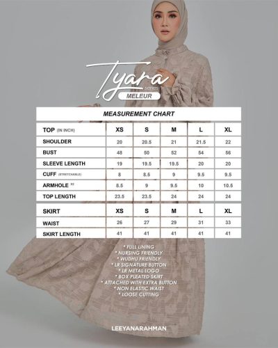 // Tyara Meleur direka dengan menggunakan material Premium silk chiffon fringe bersama diamond penuh pada baju dan kain. Rekaan bahagian bahu meleur merupakan ‘drop shoulder’ yang menampilkan gaya ‘loose’ bersama balloon sleeve yang menambahkan gaya pada meleur ini. Skirt box pleated membuatkan si pemakai kelihatan lebih tinggi dan sesuai digayakan untuk aktiviti formal atau kasual.